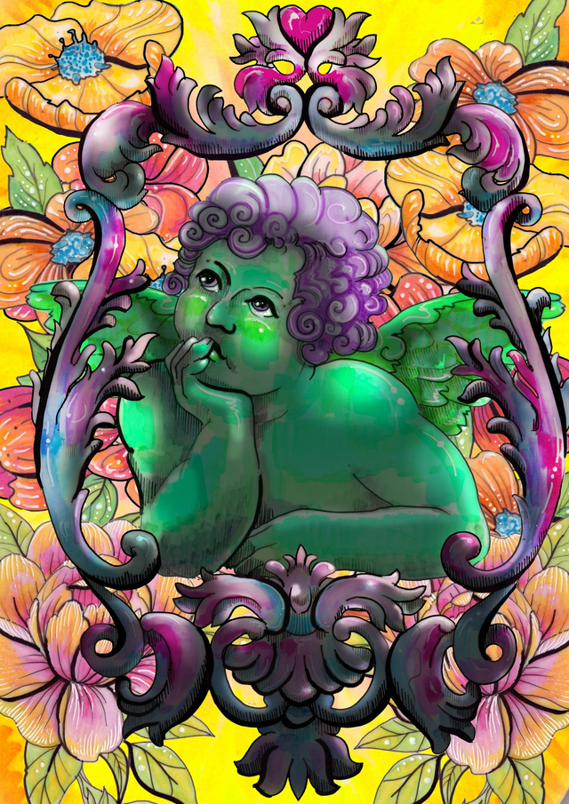 Introducing 'Cherub Dreaming' A3 print - a visually stunning artwork inspired by tattoos and the maximalism movement. Featuring a striking cherub with intricate details and bold coloring, this piece is printed on high-quality paper for a flawless finish. The gold background adds a touch of opulence and sophistication, making it the perfect statement piece for any interior. Whether you're into kitsch or maximalist decor, this print will add a touch of edgy elegance to your home or office. Order yours today to transform any space into a vibrant work of art.