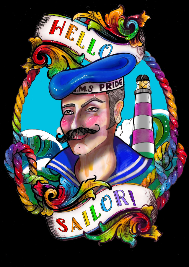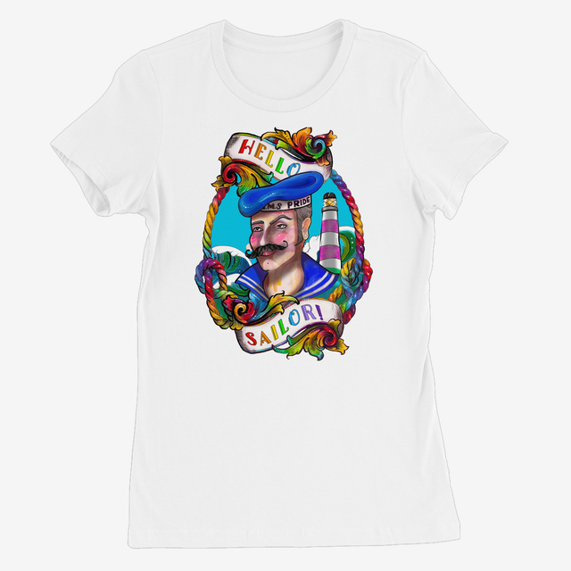 Inspired by a mix of classic seaside postcards and classic tattoos, 'Hello Sailor' is a cheeky t-shirt showing a saucy sailor surrounded by a rainbow rope frame and scrolls with rainbow text. It comes in a unisex size with a V-neck, in high quality cotton which is fully machine washable. The price includes postage to any UK address.