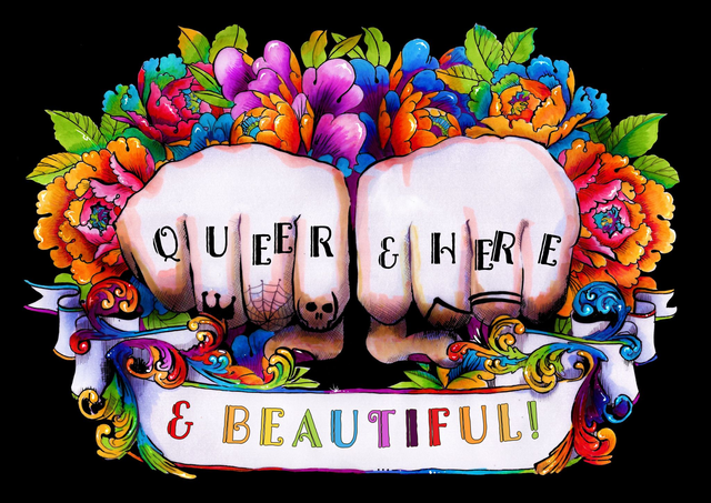 Inspired by tattoo and queer culture, the design show a set of knuckle tattoos with 'Here & Queer' on them, and '& beautiful' on a rainbow banner beneath, all surrounded by fabulous rainbow flowers. It comes in a unisex size with a V-neck, in high quality cotton which is fully machine washable. The price includes postage to any UK address.