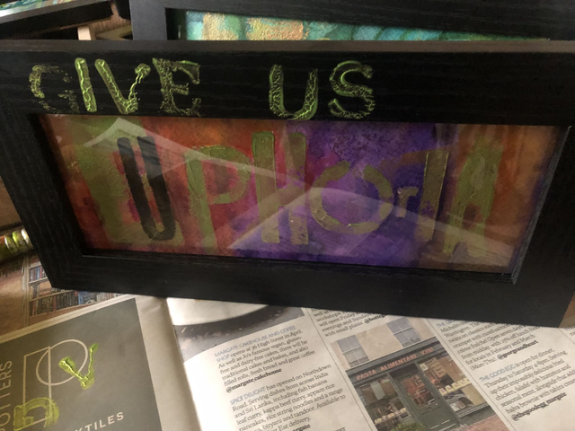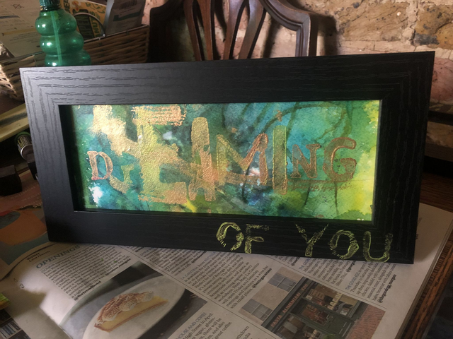 This is a original art piece made to order, which celebrates those lyrics that give you chills! You choose your background and then I will print the word of your choice across it using vintage wood block prints, and then add up to three words on the frame to complete the lyric. For example, if you love the song 'Dreaming of you" by Blondie, I will print the word DREAMING on the abstract background, and the the word 'Of You' on the frame below. The finished piece is framed, so will be sent to you read to gift.
